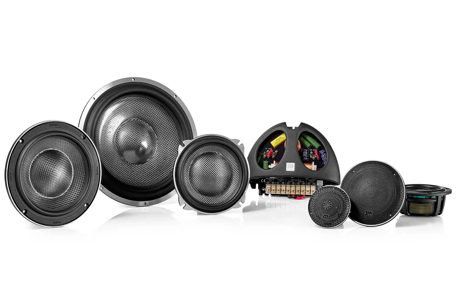Includes a pair of Elate Carbon MW woofers, Elate Carbon MM3 midrange, Elate Alto tweeters, and Lotus grilles (excluding 5.25”and 9”). Crossovers sold separately.